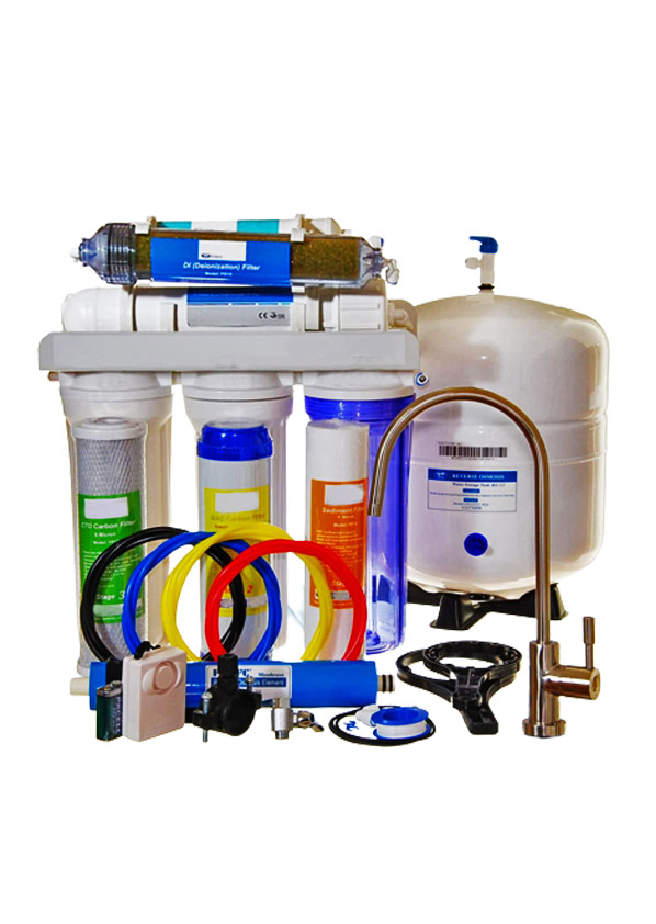 A 7-Stage 75GPD Double-DI RO system with twin outlets is ideal for aquariums and drinking water.